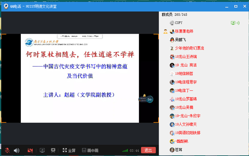 为了传播中华优秀传统文化,引导师生领悟中华文明之智慧与精神,结合当前“抗疫”主题,校团委、999策略手机论坛版于3月25日下午联合举办了2020年首期明德文化讲堂。999策略手机论坛版赵超副教授在线主讲“中国古代灾疫文学书写中的精神意蕴及当代价值”,999策略手机论坛版副院长沈春蕾、校团委副书记赵硕和我校300余名师生参与讲堂。999策略手机论坛版副院长沈春蕾副教授主持讲堂。