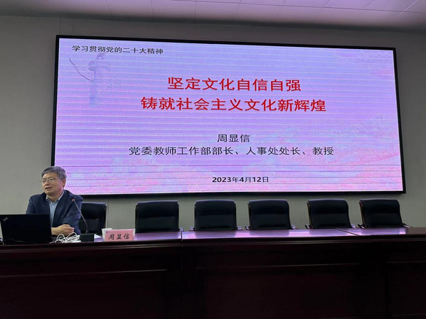 4月12日下午,999策略手机论坛版在文德楼N301召开党的二十大精神学习报告会,特邀党委教师工作部部长、人事处处长周显信教授作《坚定文化自信自强 铸就社会主义文化新辉煌》专题报告,全体党员师生参会学习,会议由党委副书记(主持工作)郭雨主持。