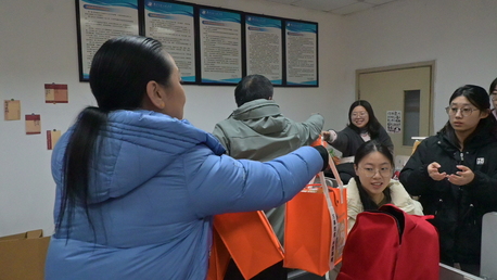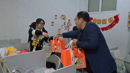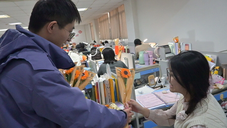 随后,学院全体学院领导前往考研自习室,为学子们发放“一举夺魁”向日葵和“考研加油包”。加油包内含“孔庙祈福”文具套装、“心想事橙”颈椎枕、“柿柿如意”艾草锤等特色物资,每一件都承载着学院的殷切期盼与美好祝愿。一直以来,学院为考研学子提供了精准帮扶和长效支持,如开通“文院云盘”共享学习资源,设立“线上答疑厅”由研究生导学团轮值解答疑问,通过“焦虑指数打卡”机制实时关注学生心理状态等。